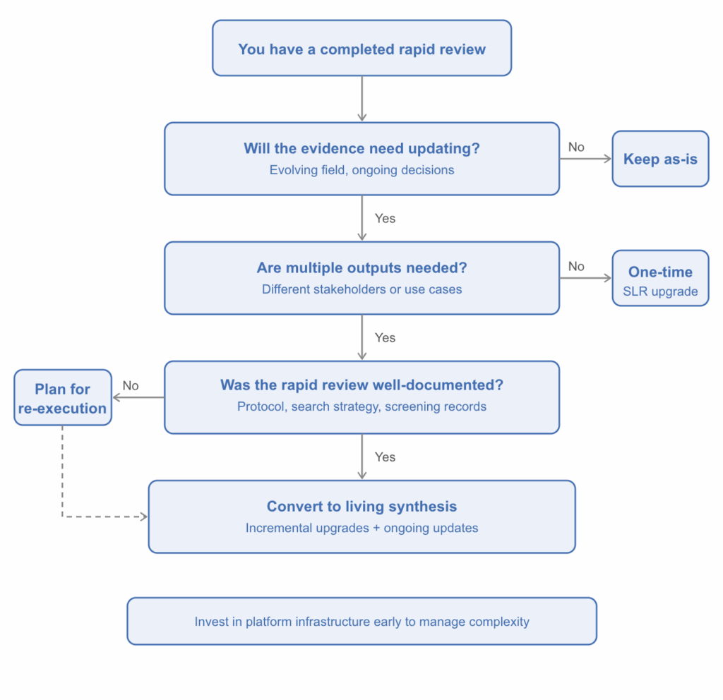 Not every rapid review needs to become a living synthesis. The decision flowchart below can help you think through whether the conversion makes sense for your situation.