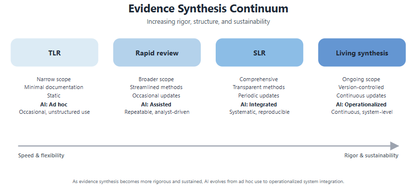 Use of AI also maps naturally onto this continuum. At the TLR and rapid review end, teams tend to use AI freely with minimal documentation. As you move toward living synthesis, AI becomes more valuable for managing the operational burden of ongoing updates. However, it needs to be wrapped in validation, audit trails, and version-tracked methodology. The path to living synthesis isn’t about removing AI, it’s about formalizing how AI is used.