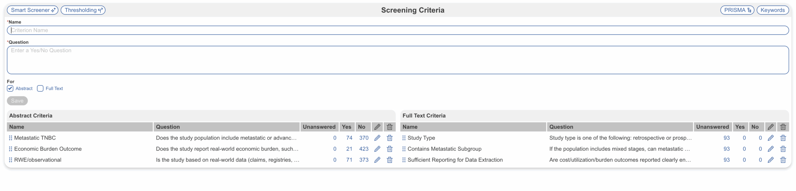 This is the first feature in Nested Knowledge where AI can begin screening immediately without requiring any human-screened examples first. Simply define your criteria, and the AI can start working right away.