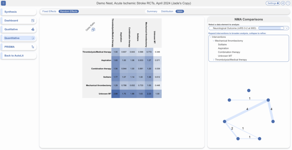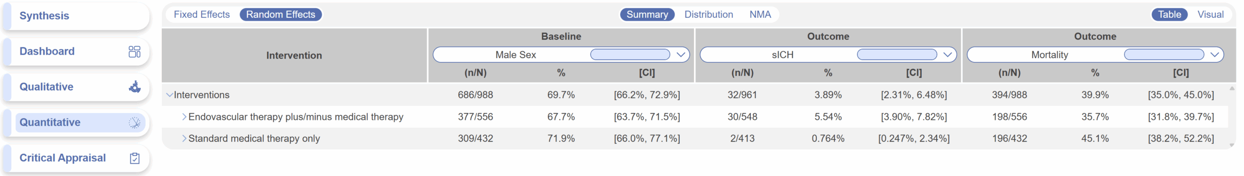 Once Smart MA Extraction is complete, the extracted data will be available within the MA Extraction field. This view enables users to identify the interventions that were automatically extracted and included in the analysis. The extracted data elements are also accessible within the Quantitative Synthesis module.