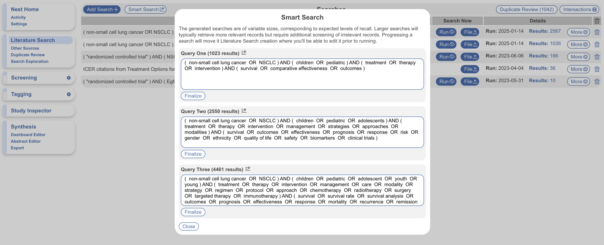 Smart Search is a tool that assists you in building a search query based on your research question. In particular, you can input and refine a research question in order to generate three PubMed queries of varying sizes for you to finalize and edit as an Automatic Search. When refining a research question, a chatbot will prompt you to answer questions on specifics such as demographics, outcomes to help build out a better research question.