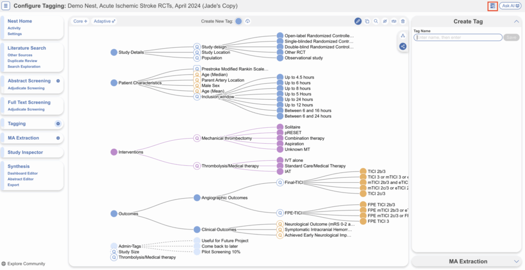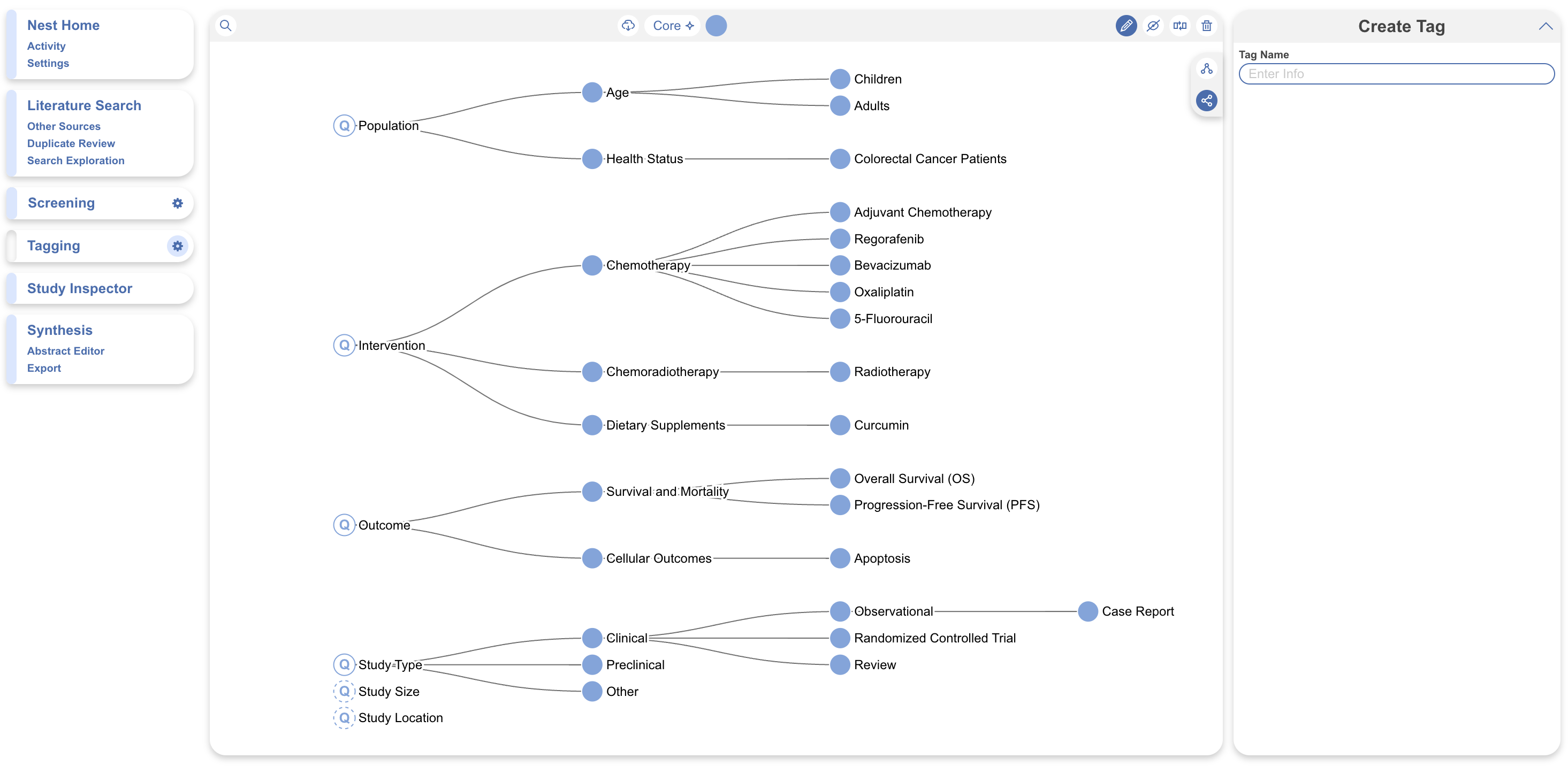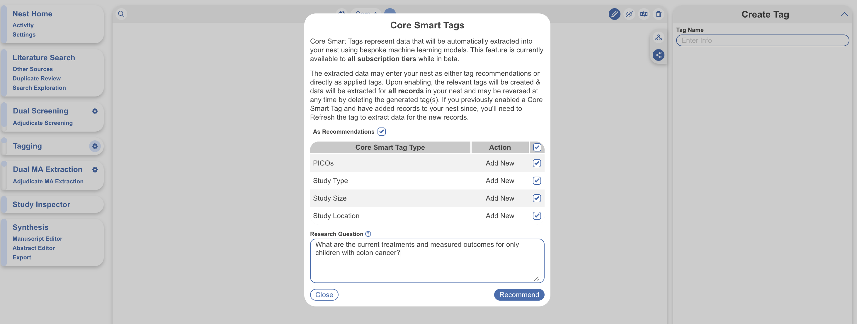 After adding a search to your nest, you will want to configure a data extraction/tag hierarchy. Use Core Smart Tags to input your research question, generate a hierarchy of PICOs, Study Type, Location and Size and either recommend evidence or immediately extract this data from all studies in your nest.