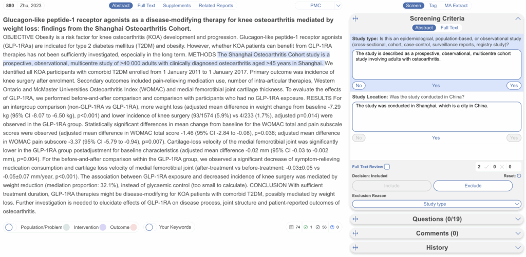 RoboPICO also auto-highlights PICOs found in Abstracts during Screening to aid you to more efficiently make a decision on inclusion or exclusion of the record but may be toggled off (in red).