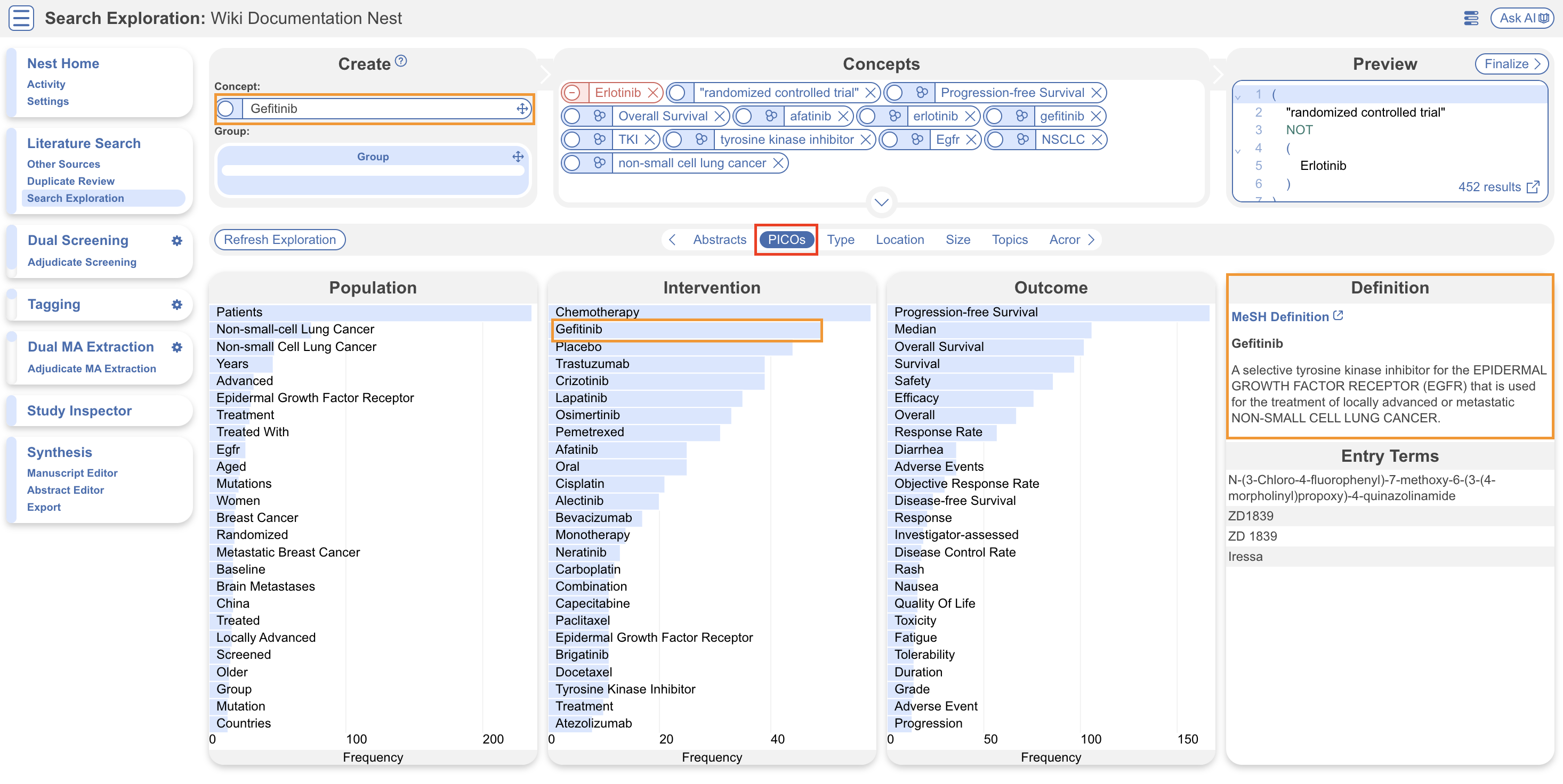 RoboPICO works to provide the most commonly reported Population, Interventions, Comparators and Outcomes (PICOs; in red) in Search Exploration to help you build an effective search query. When you use the Search Exploration tool, RoboPICO automatically runs when you hit “Refresh Exploration.” You can select these terms, view their definitions, and build them into your search query (in orange).