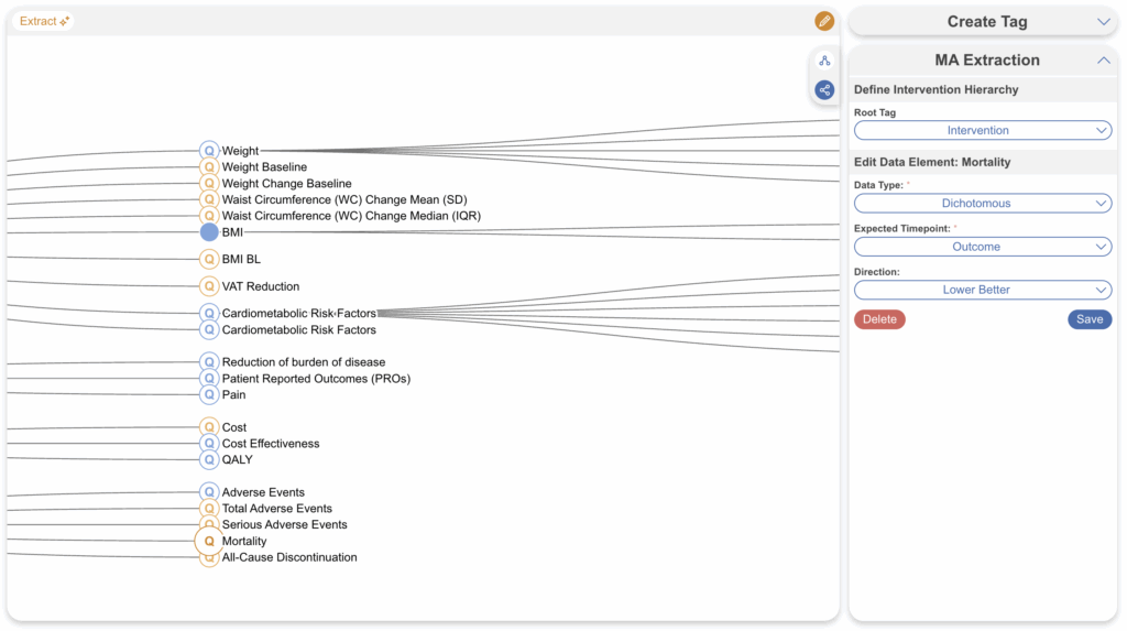 In order to perform meta-analytical extraction, you first need to Configure Interventions and Data Elements, which you do from the Configure MA Extraction page in order to reuse the tag hierarchy.