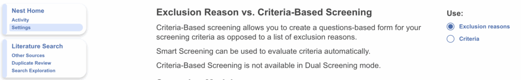 After selecting a Screening mode, the next step in the Screening process is configuring the inclusion/exclusion criteria.