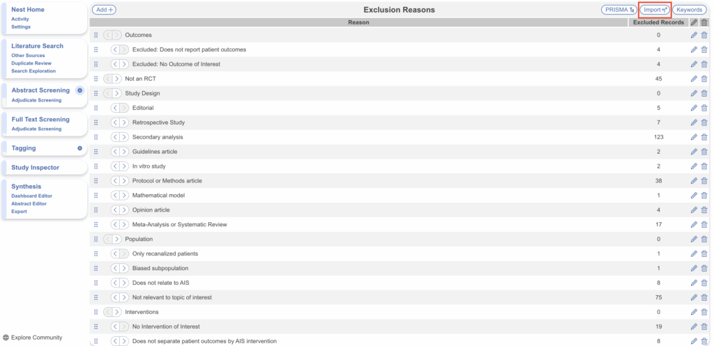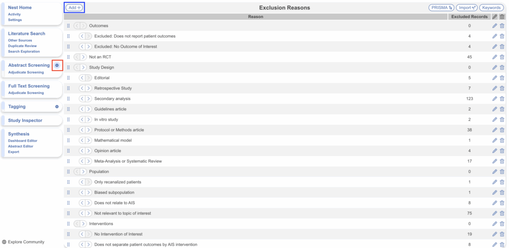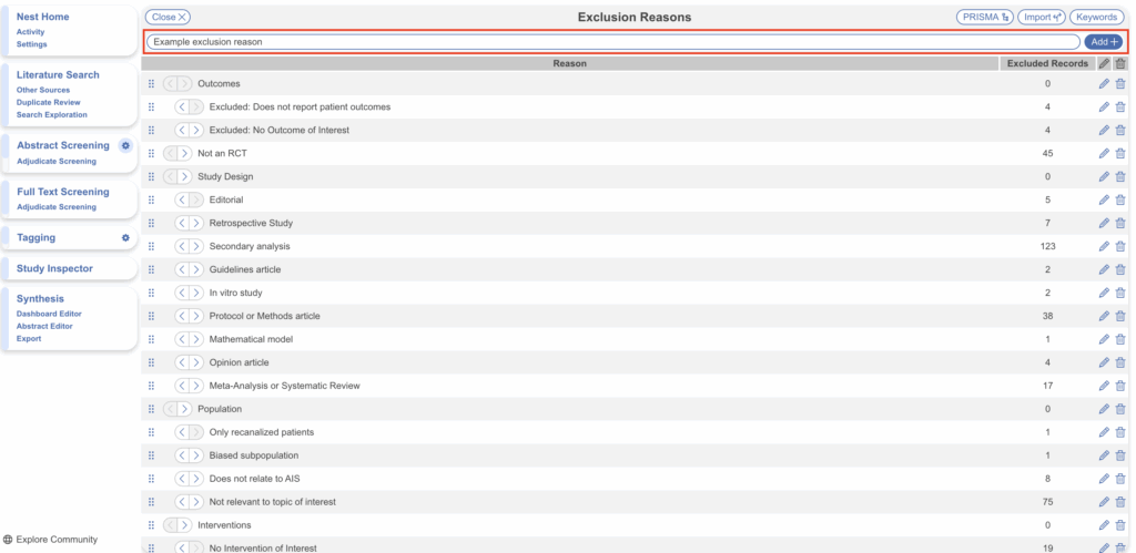 - Configure Exclusion Reasons (default): list all reasons that a record would be excluded from your nest according to your protocol, then reviewers screen studies and either Advance/Include or Exclude for a listed reason.