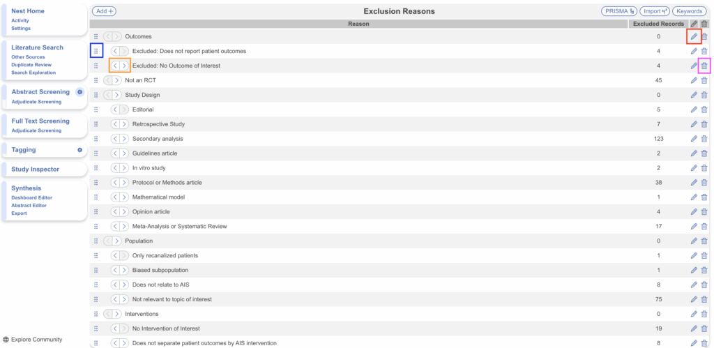 To order your list of exclusion reasons and determine how they are displayed in Screening, click the 6 dots icon (blue) and drag and drop in your desired order. To order your exclusion reasons in a hierarchical fashion, use the arrows to indent reasons beneath others (orange). In the below example, “Excluded: No Outcome of Interest” is placed beneath “Outcomes”. You can customize this according to your study design and exclusion criteria. The format will be displayed the same in the screening workflow.