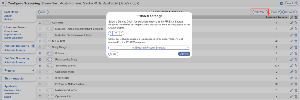 - Group exclusion reasons shown in the auto-generated PRISMA diagram. If you have created hierarchical exclusion reasons, you can choose to display all reasons (i.e. both specific and root/parent reasons) or root reasons (the first set of grouping), and so on.