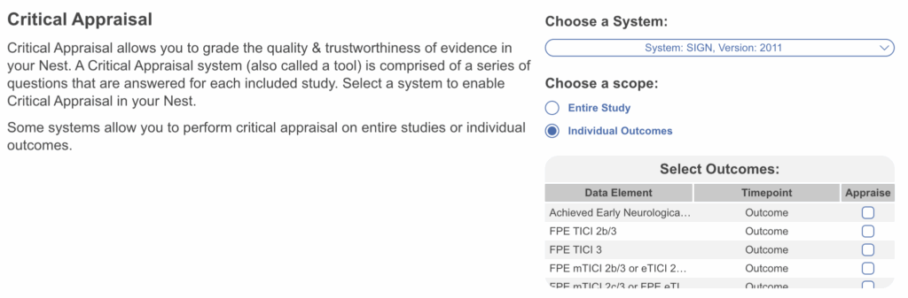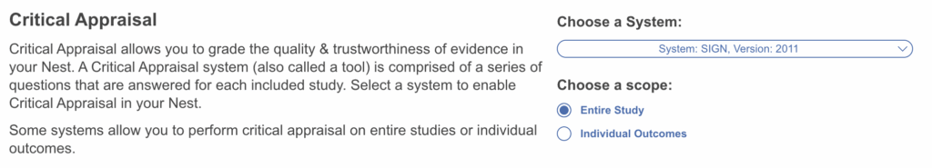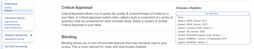 Head to Nest Settings and select the Critical Appraisal system of choice. After selection it will be added to the left hand menu.