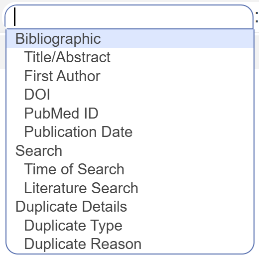 Bibliographic, Title/Abstract, First Author, DOI, PubMed ID, Publication Date, Search, Time of Search, Literature Search, Duplicate Details, Duplicate Type, Duplicate Reason