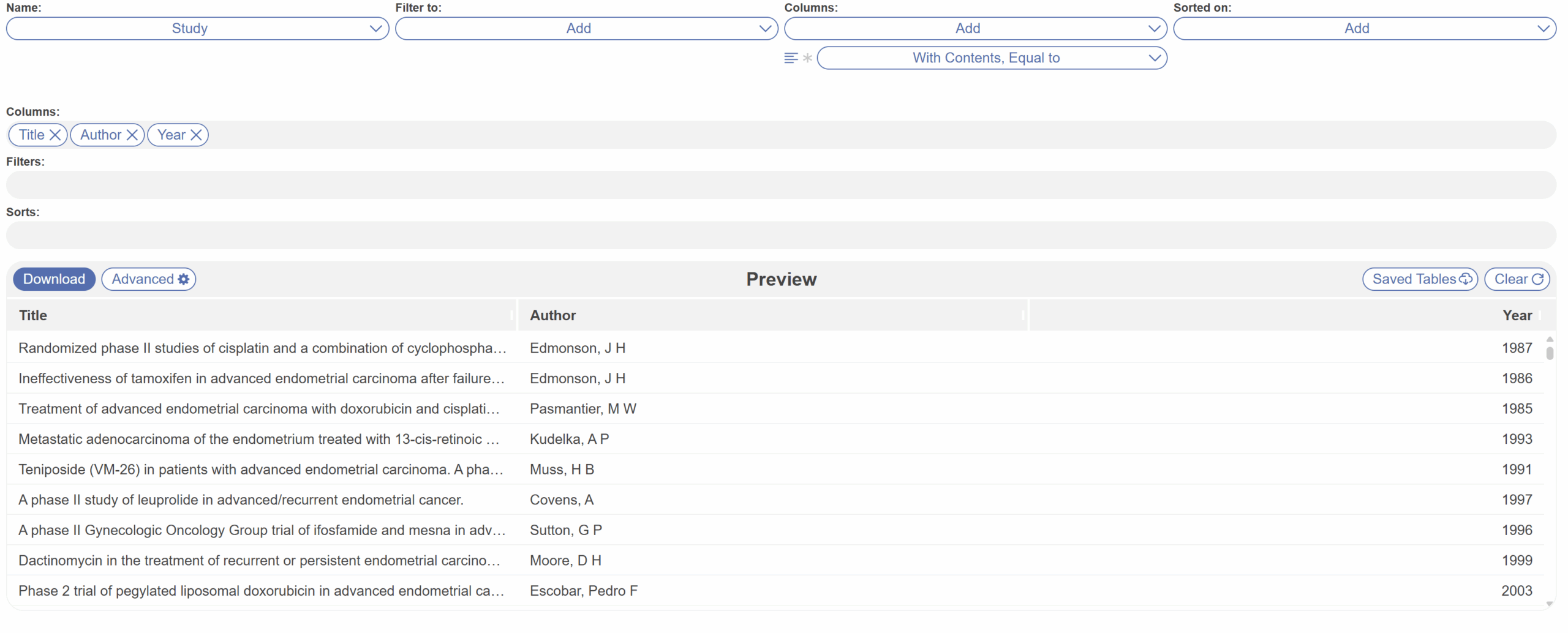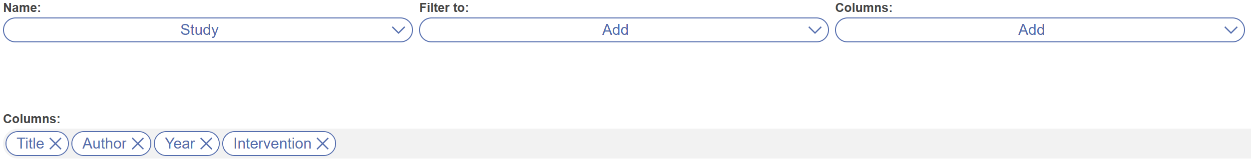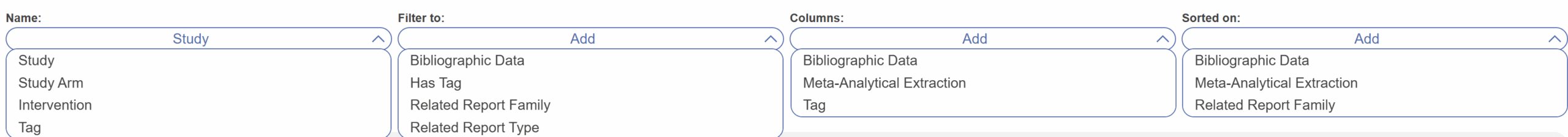 Select “Study” in the drop-down, and proceed to add Filters (tags or related reports) and Columns– you will be able to choose among Bibliographic data, Tag data, or Study Size. You may also sort the listed studies by bibliographic data, MA extracted data or related report data. This will create a table where each row represents a single study and each header is either a bibliographic attribute or a tag.