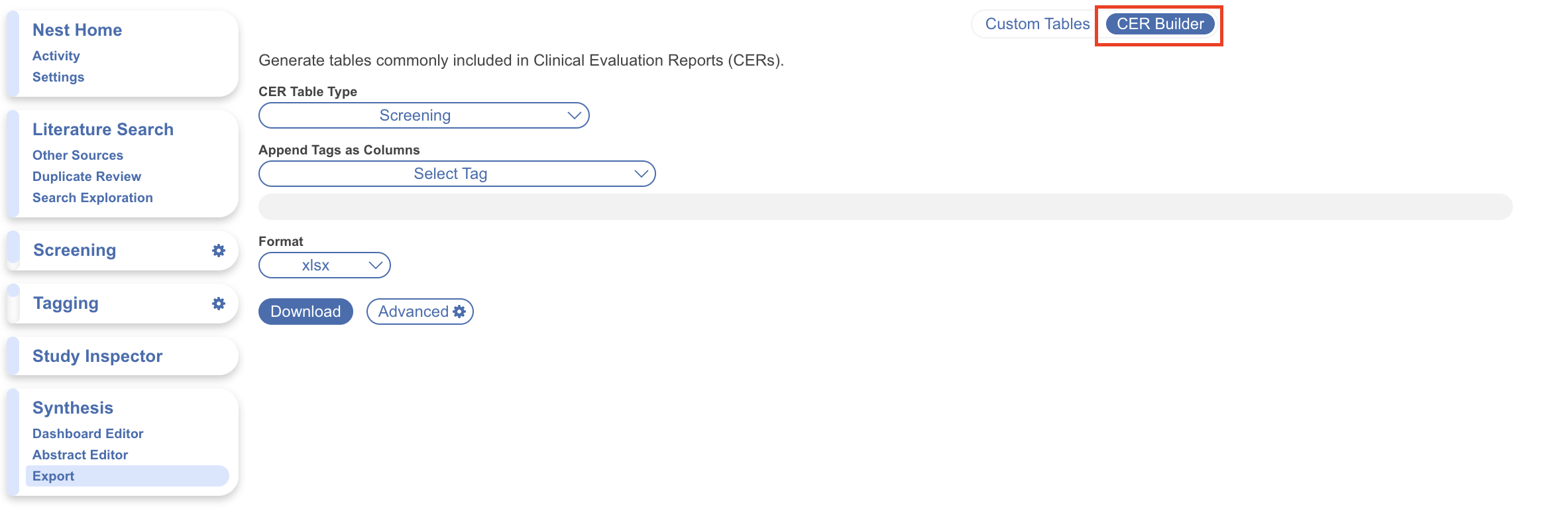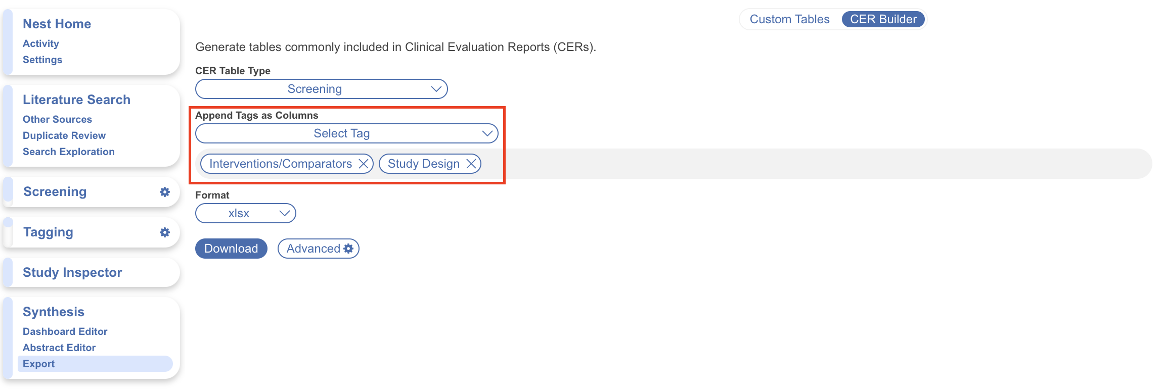 For the CER Screening Table specifically, by default, the columns are separated out into Authors, Title, and Year. If you wish to consolidate these columns into a singular “Reference” column, navigate to “Advanced” settings, and check “Consolidate citation columns” prior to Download.