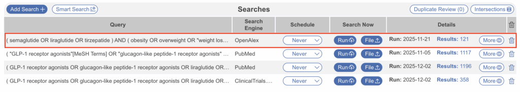 We use the Query, Search Engine, and Date as part of the record-keeping on where the records you screened came from. You will be able to access this information in the “History” tab on any study, and it also impacts your PRISMA Chart.