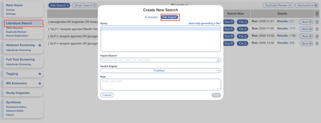 Where available, NBIB files can be exported from your database of interest and uploaded into the Literature Search module.