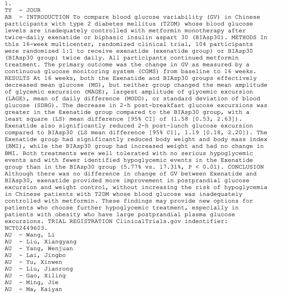 If the RIS file does not load any of the studies, check to make sure the RIS file is formatted correctly. Change the file to a .txt file and look at the format. It should be in the preview format below; if not, edit the file before uploading or contact support.