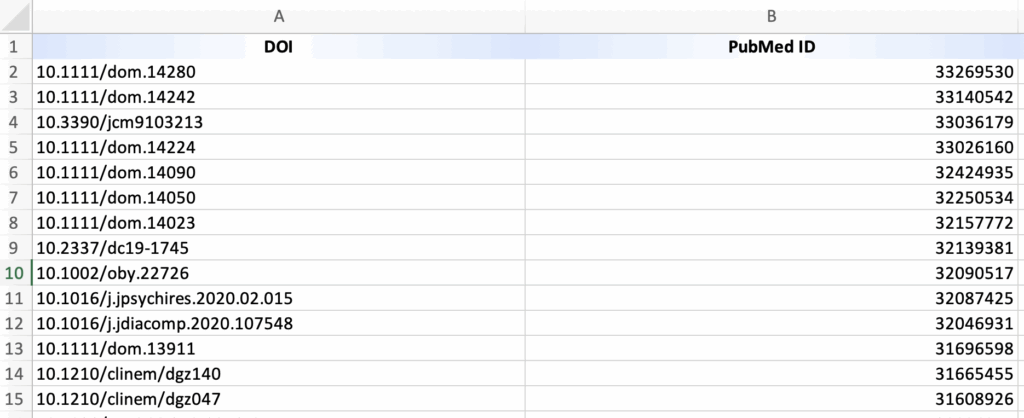 If your spreadsheet contains only DOI and/or PMID/PubMed ID, records and bibliographic data are imported from PubMed and CrossRef. While this generation of bibliographic data is accurate, there may be gaps. Method 2 ensures import of all desired data from an existing spreadsheet.
