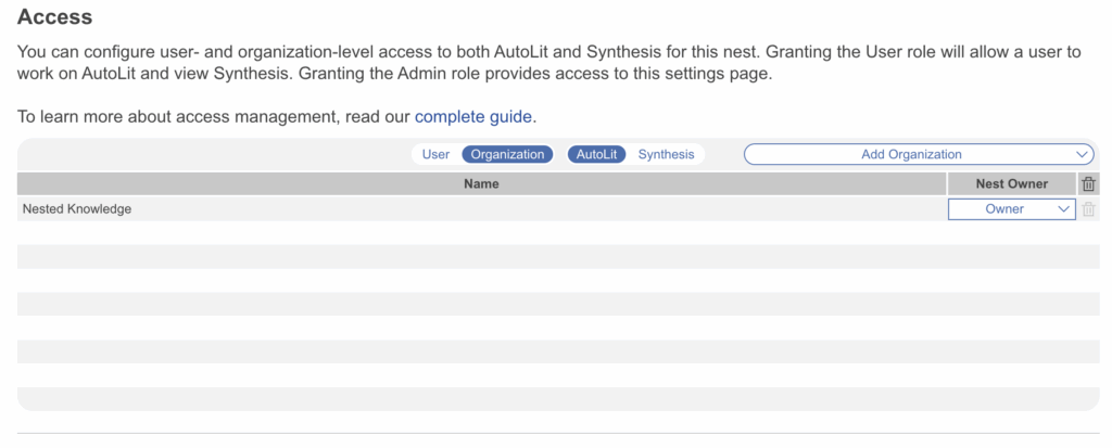 Next, “Add Organization.” The key difference here to AutoLit access is, since Synthesis access is restricted to viewing and sharing the outputs, there is no access level to be toggled. Any organization(s) added to Synthesis will not be able to see or edit any parts of AutoLit in the nest.