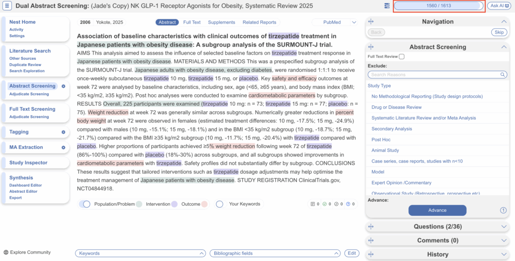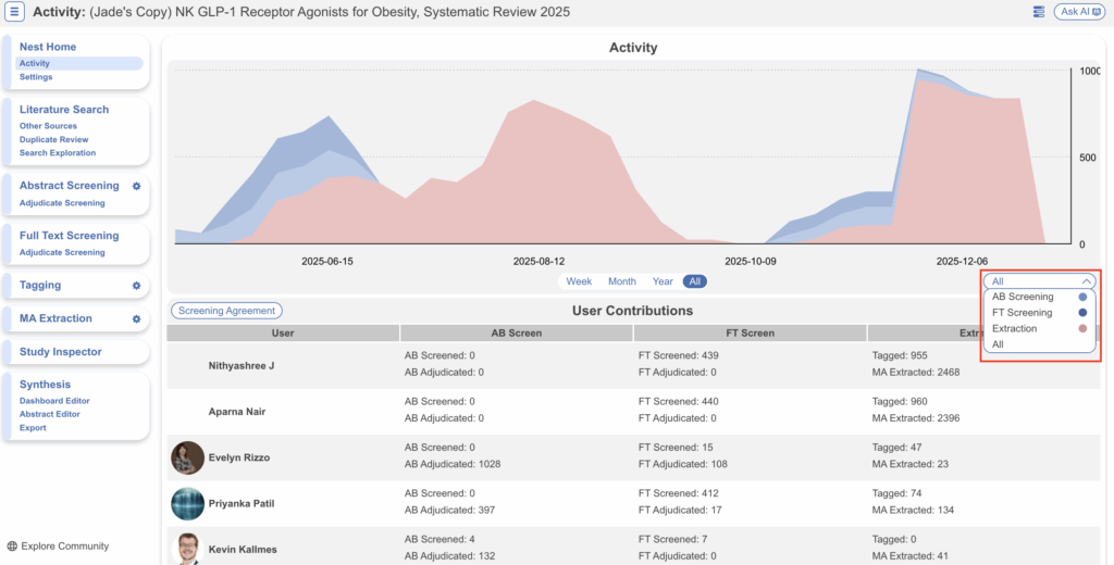 Nest Activity allows researchers to stay up to date with the progress of their review, track engagement through Synthesis view counts and, if a Dual Screening mode is in use, view Kappa Statistics/Interrater Reliability/Screening Agreement for reviewers.