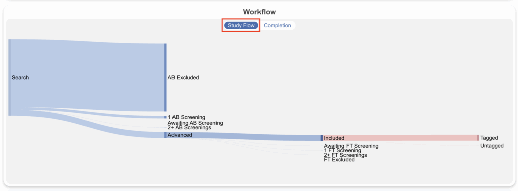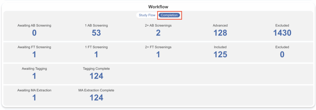 Note: unlike in the Activity box, Workflow displays numbers at the study-level. i.e. the number of studies included, excluded, tagged completely etc.