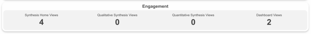 Nest outputs can be configured to be public or private in admin settings. If your nest is set to public, these measures approximate engagement with the data and visuals of Synthesis Home, QLS, QNS and Manuscript and/or Dashboard.