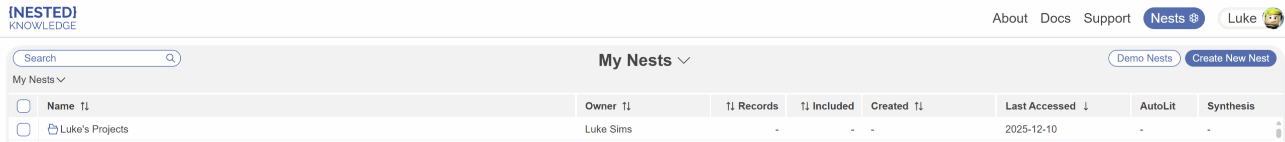 Nests are ordered by most recent access and columns provide nest names, owners, numbers of records, records included, nest creation date, access date information as well as links to the AutoLit and Synthesis portions of your nests: