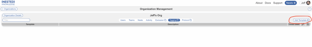 Templates are created by Organizational Owners and/or Admins. They are managed and edited from your Organizations page, and then can be used by any member to pre-populate content into any nest your Organization owns.
