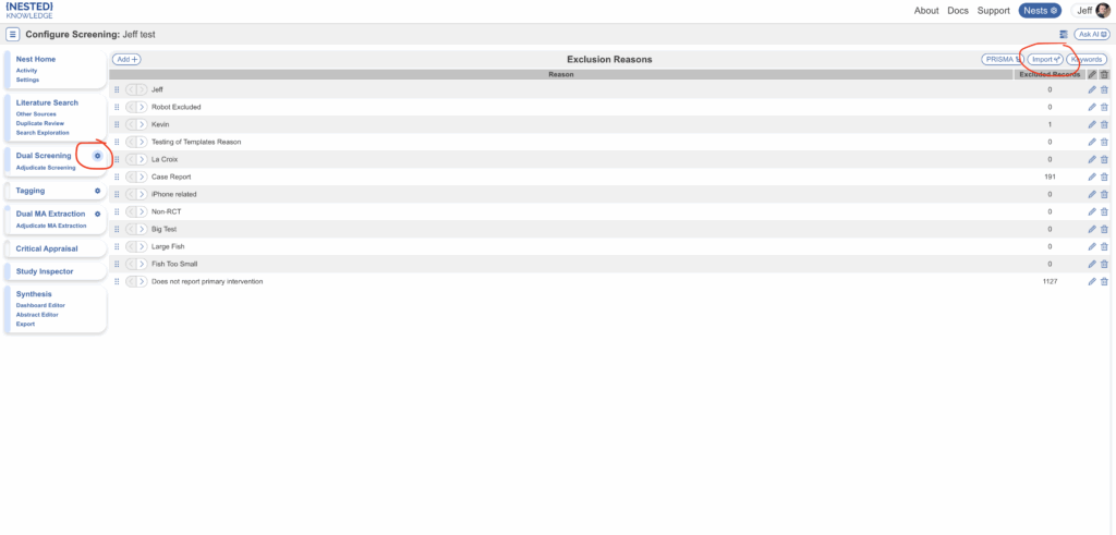 Choose a set either from our public templates or your organization’s, and click “Import” This will populate all exclusion reasons in the set to your nest. If an exactly matching exclusion reason has been populated previously, no duplicate will be created, but be careful of near-matching exclusion reasons so you do not inadvertently create duplicates!