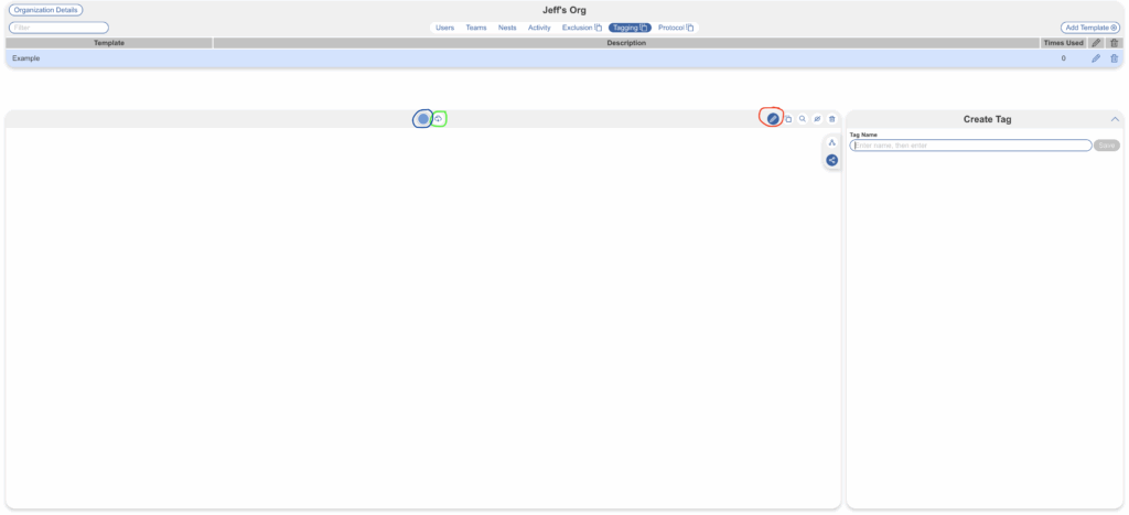 Here you can build a hierarchy to template from scratch by toggling the create tag/pencil icon (circled in red), and selecting the tag icon in the center (circled in blue) or import a hierarchy via the cloud icon (circled in green) from an existing nest.