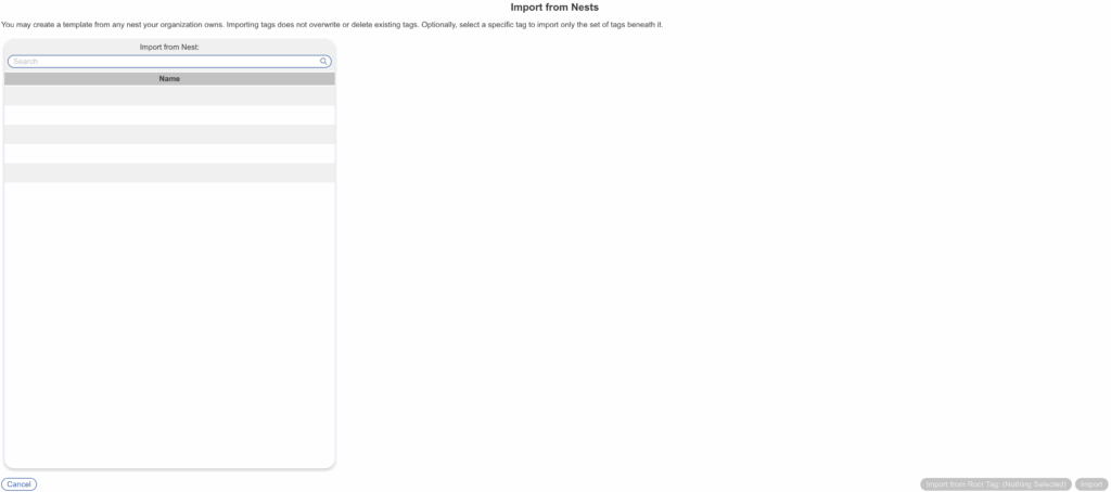 Organizational Templates will ONLY be available in nests ‘owned’ by an Organization. To learn how to assign ownership of a nest to an Organization, see the Organization Management page.