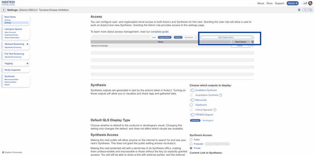 In this case, navigate to the nest containing the hierarchy you’d like to template, Settings, and assign organizational ownership: