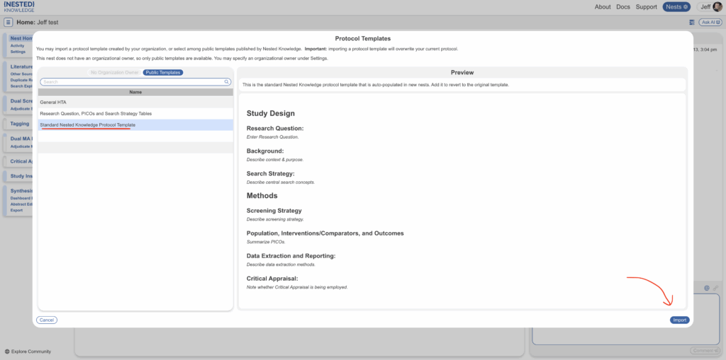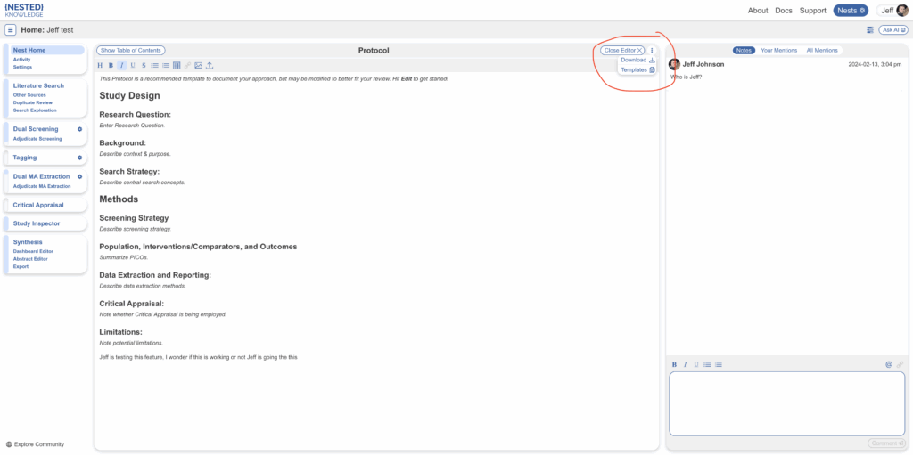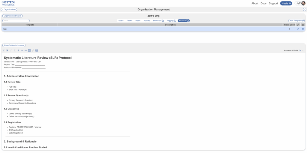 Protocol templates can be drafted in a free-text page, where you create the headings, text sections, and/or tables that can be imported into any of your Organization’s nests. For instance, a biomedical network meta-analysis protocol template could present headings and sample text describing search strategy, inclusion criteria, populations, interventions/comparators, and outcomes (PICO) of interest, and statistical methods.