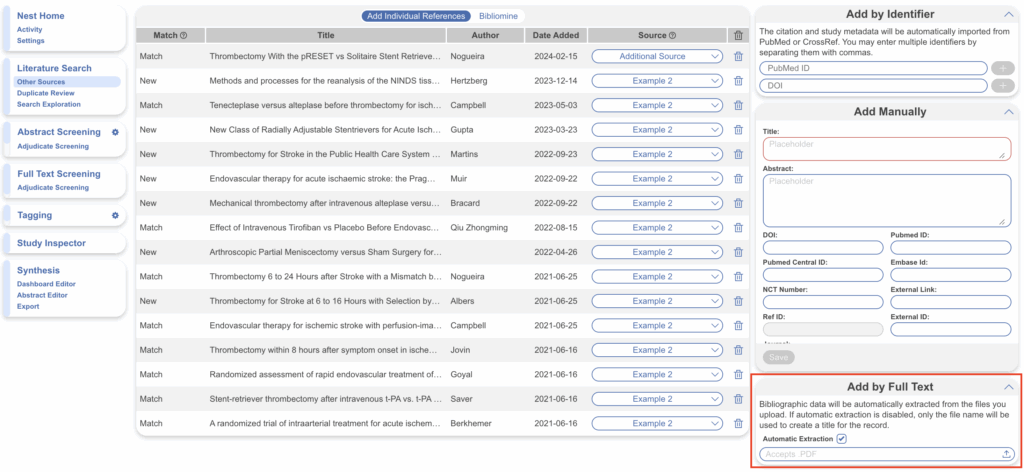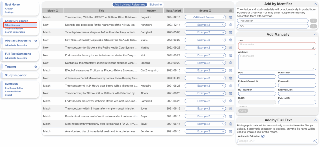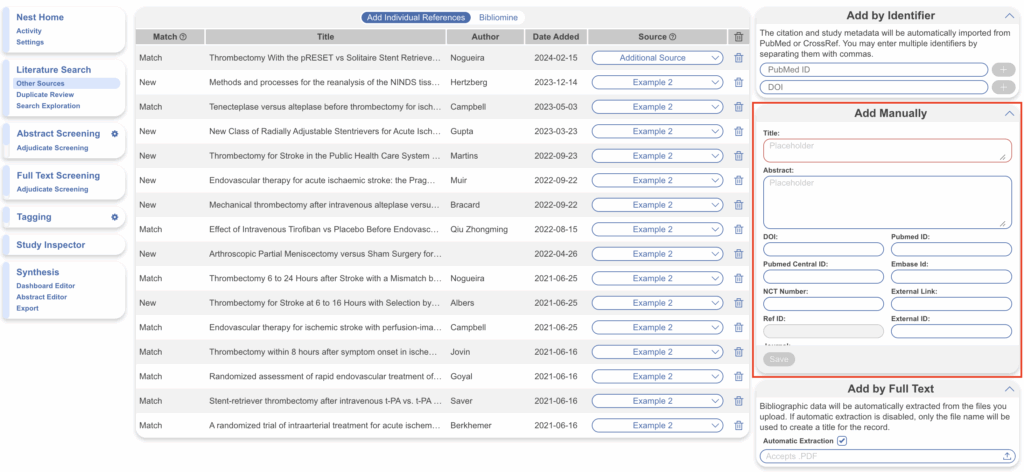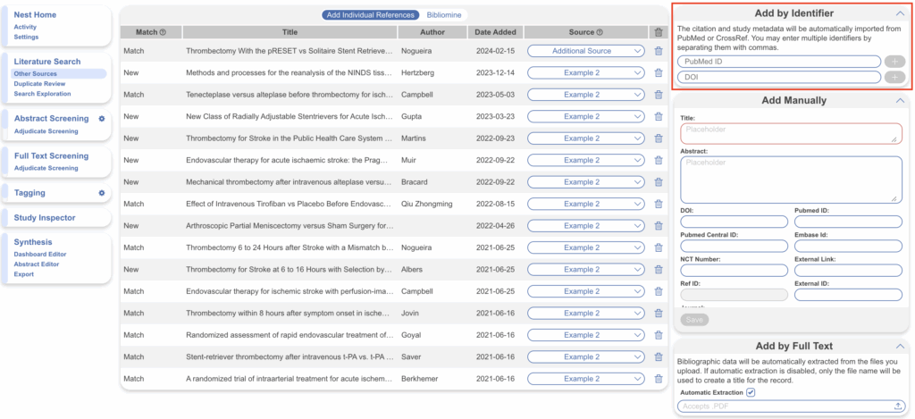 If you have any “Expert Additions” (Studies that were not found by AutoLit, but should be included in screening and subsequent steps), that are indexed on PubMed, you can manually add them to your Nest. There are three ways to add individual references