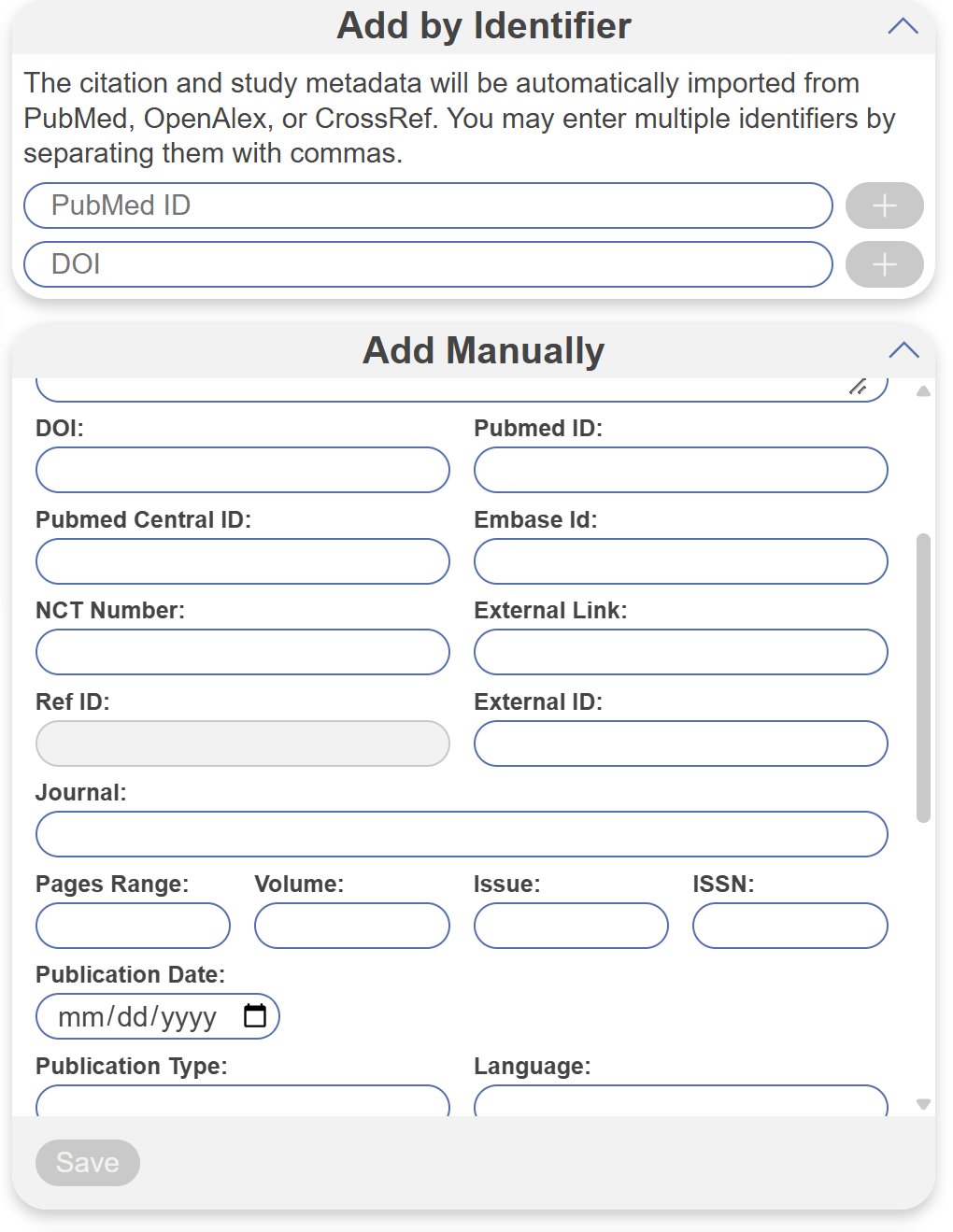 For clinical trials, news articles, and other data sources that lack a PMID, you can enter information manually.