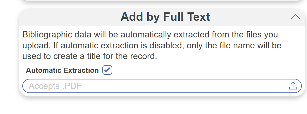 Uploading full texts in bulk can be found under “Add by Full Text”. You can upload up to 2GB (total for all files) at once. By default, bibliographic data from each PDF will be automatically extracted and inputted into the record’s data in the nest. If you’d prefer to turn this off, uncheck Automatic Extraction, and only the file name will be used to create the record in the nest.