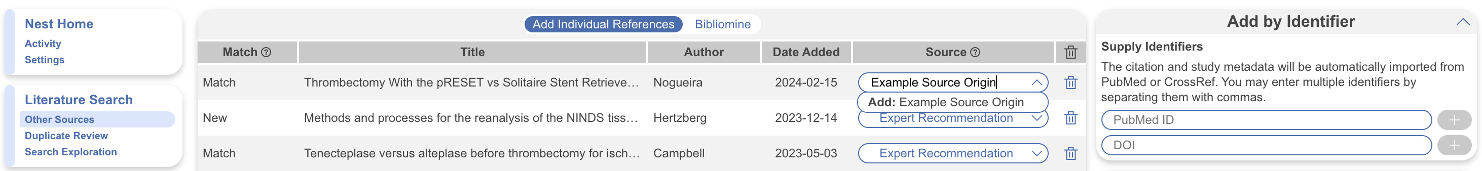 If you have any “Expert Additions” (Studies that were not found by AutoLit, but should be included in screening and subsequent steps), that are indexed on PubMed, you can manually add them to your Nest. There are three ways to add individual references