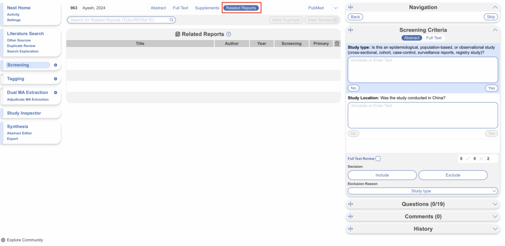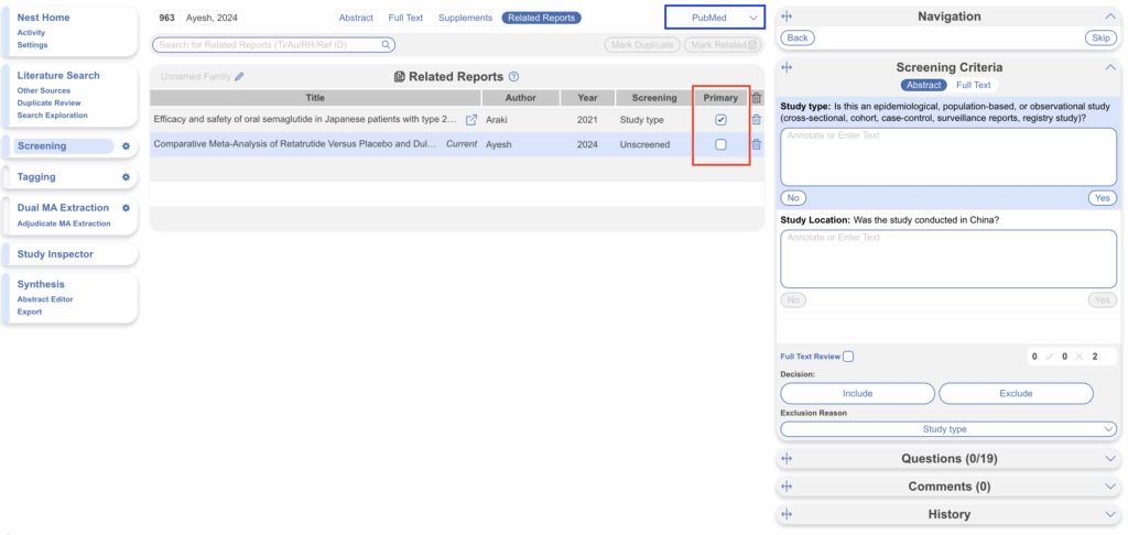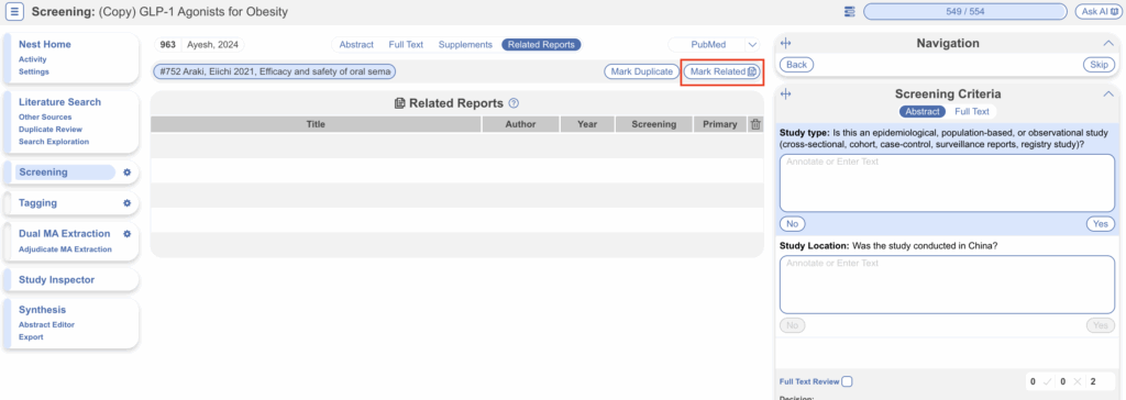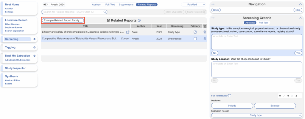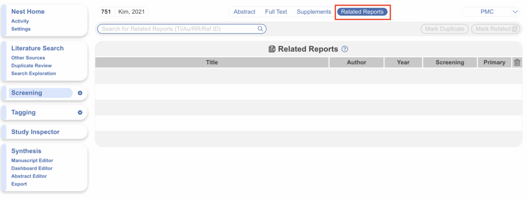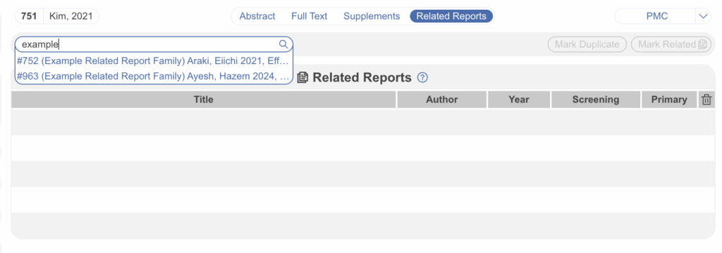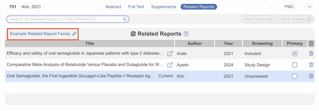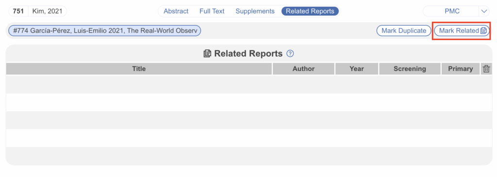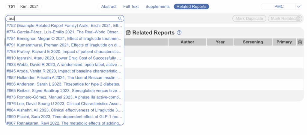 Under the Related Reports tab, you also have the ability to Mark studies as Duplicates. If you find a study that was not automatically de-duplicated, click Related Reports, select Mark Duplicate, and then select the original study. Completing this action will remove the study from your screening queue and put it in the duplicate queue.