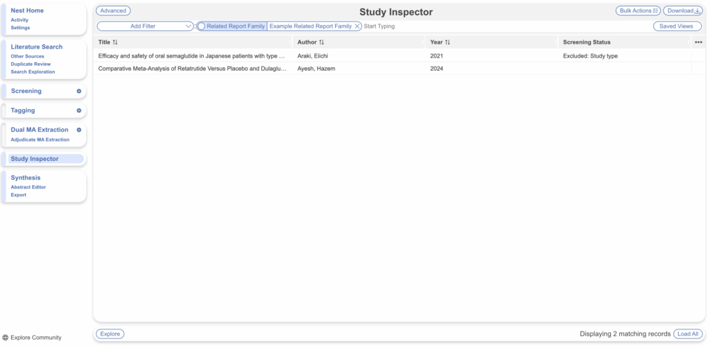 Once you have assigned studies to their related reports, you will naturally want to view them again. You can do so via the “Related Report Family” filter in Study Inspector. This allows you to filter to, view and edit specific sets of records that are related to one another. The filter dropdown will display the family name if customized, otherwise the primary report author & year, and if no primary report is selected, RefIDs will be displayed in place of family name.
