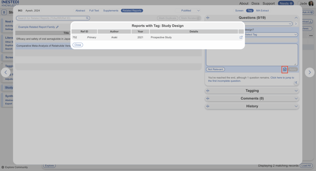 When you mark a study as a related report, this affects 1. the automated PRISMA diagram output and 2. tags applied to a record with a related report are displayed in both the record and its related report.