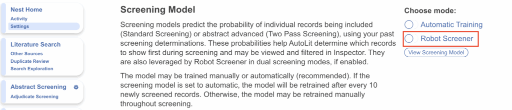 - Dual Standard Mode: Robot Screener replaces a reviewer in the singular round of Screening based on Inclusion Probabilities.