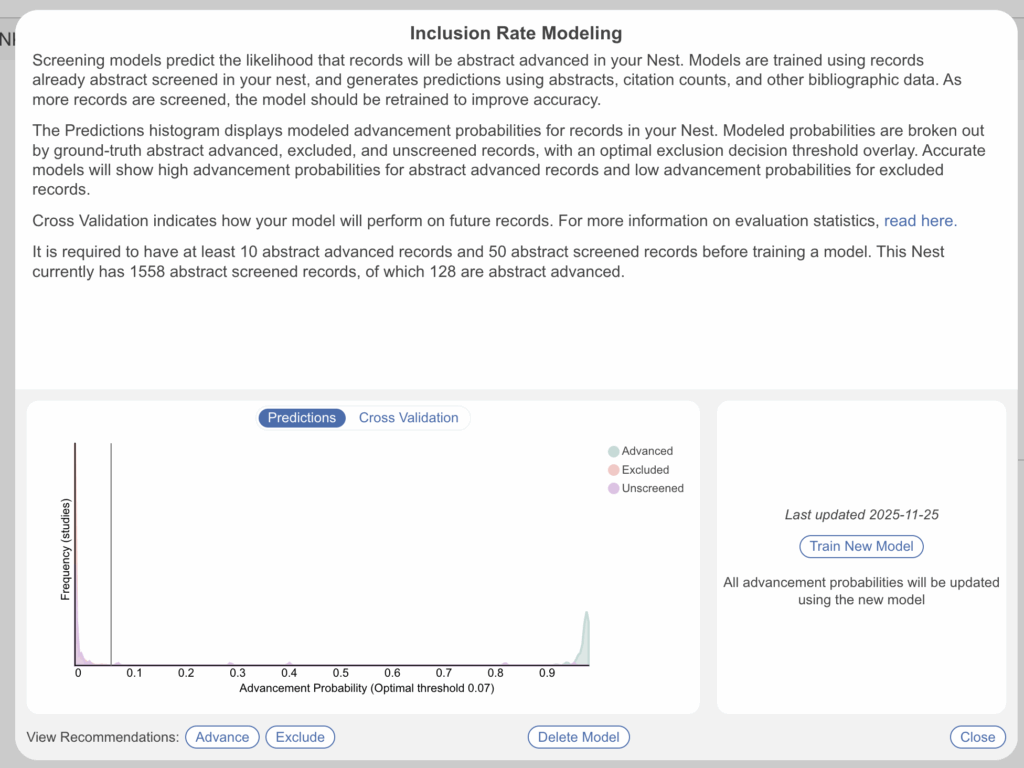 You can also view the Robot Screener recommendations in the Screening model modal. Select “Advance”/“Include” to view studies the Robot has advanced/included, or “Exclude” for excluded studies– these are both shortcuts that take you to Study Inspector to show you the corresponding subsets of studies. Otherwise, the filter can be manually added from Study Inspector. From this modal, you can also delete the model if you wish to start again from scratch.