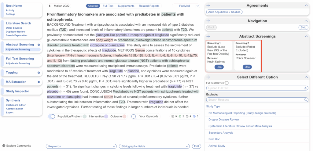 - Internal validation: Nested Knowledge assessed the Recall and Precision of Robot Screener in 19 projects with over 100,000 cumulative decisions, finding significantly lower Precision than humans (that is, humans correctly exclude studies more often) but significantly higher Recall– meaning that the Robot Screener misses fewer includable records. In this analysis, Robot Screener was found to have 97.1% Recall.