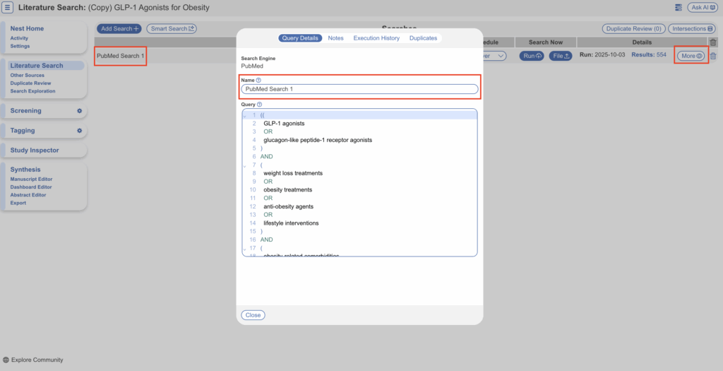 For other search guidance, see lesson 3 in our online course, which outlines optimal early exploration techniques, as well as teaching about the basics of Boolean operators. We generally recommend search strategies that limit unnecessary screening; there is an upper limit on all Searches and Imports of 10,000 records, and while the total number of records in a nest does not have a strict limit, we advise that searches above 10,000 records may be narrowed with the addition of appropriate filters or hedges.