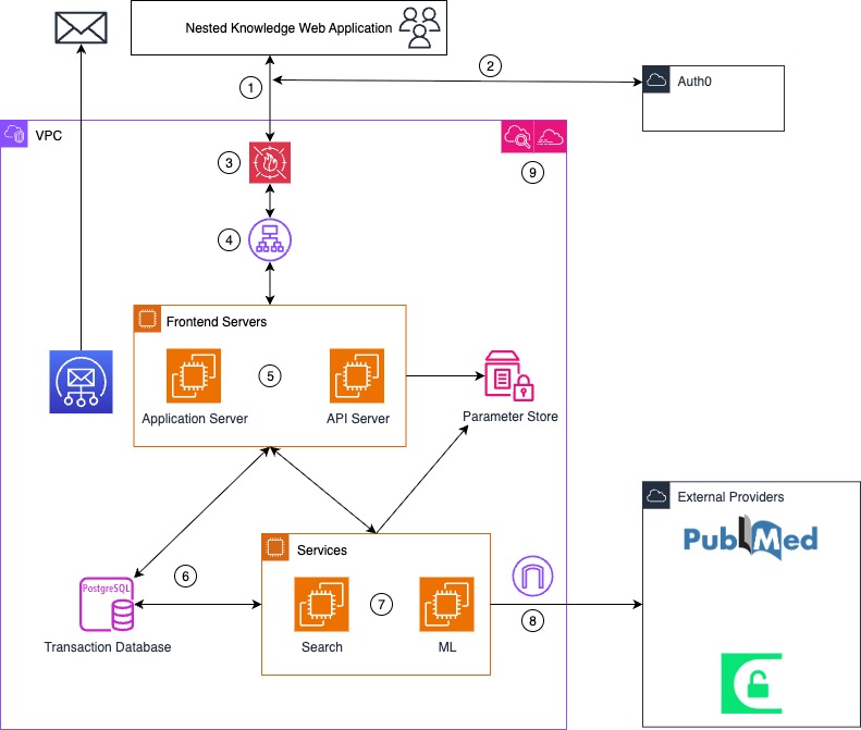 The Nested Knowledge client application is served by an application server and content and interactions provided by an API server; both of these servers run behind a load balancer. The API server communicates with the Search and ML backend services as well as the database. Certain functions of backend services communicate with external (public) APIs through an internet gateway. The frontend servers, services, and database all run in a Virtual Private Cloud (VPC) for network isolation. The frontend load balancers are exposed to receive requests from the public internet and are protected with a WAF using AWS’s Core Ruleset. The client and server applications communicate with an external service, Auth0, for authentication; all communications with Auth0 are encrypted.