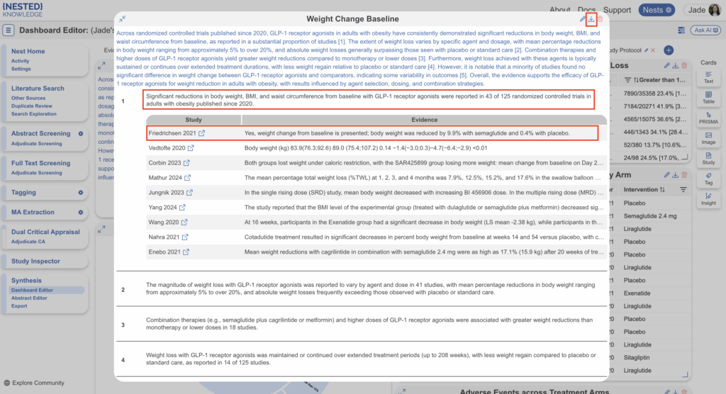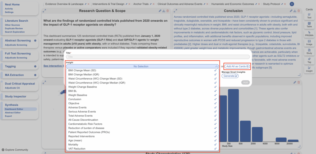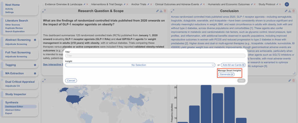 Smart Insights is an AI-assisted summarization and synthesis feature within the Nested Knowledge platform that enables users to generate fully traceable written insights directly from extracted evidence. A defining characteristic of Smart Insights is its emphasis on transparency and traceability. Every sentence generated by the AI is explicitly linked to the underlying source material. Individual claims within an Insight are supported by highlighted elements in the original text or data, allowing users to verify exactly how each statement was derived.