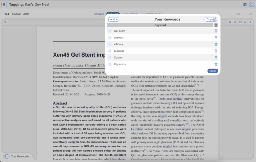 User Keywords can be added or edited in two places; the list of User Keywords can be populated and edited from the Configure Screening page, and then additionally populated and edited from the Abstract View for any study within a nest.